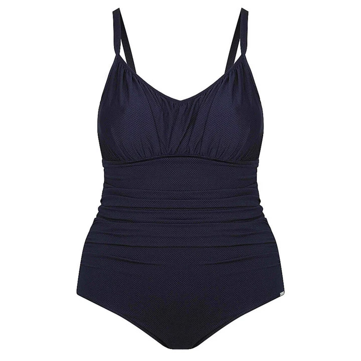 This lovely Honeycomb Underwire One Piece Swimwear is a gorgeous one piece swimsuit available in a gorgeous navy blue and in our chic honey comb textured fabric. The fabric is textured for a stylistic trend and gives a fun twist to regular one piece swimwear fabric. This plus size one piece swimwear is a perfect addition for any woman looking for more tummy coverage without compromising showing off your neckline or legs, and while staying in style this summer.