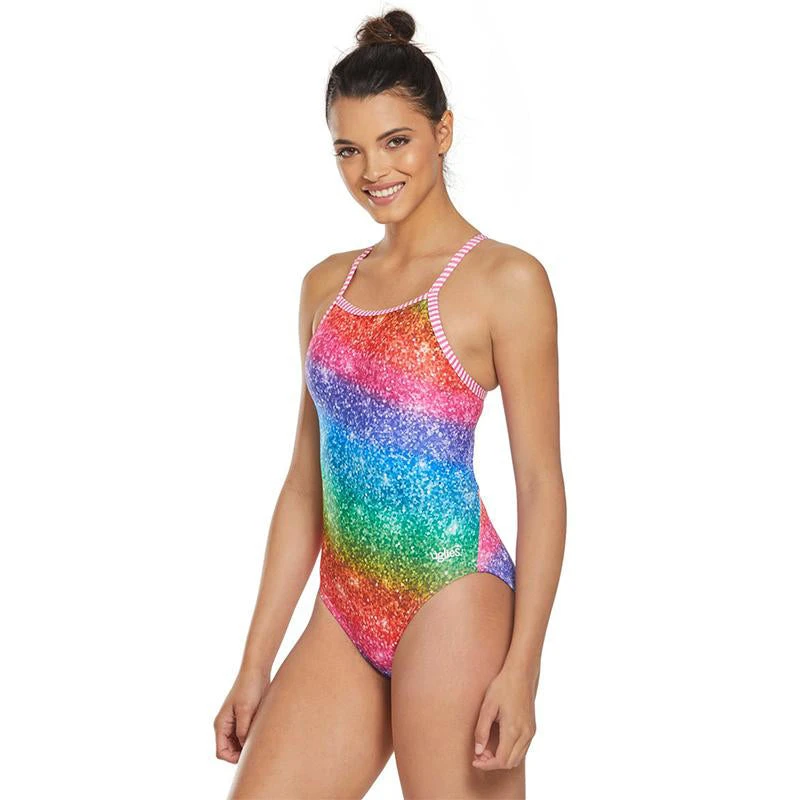 - Provides full coverage and durable keyhole silhouette with Uglies striped criss-cross straps.