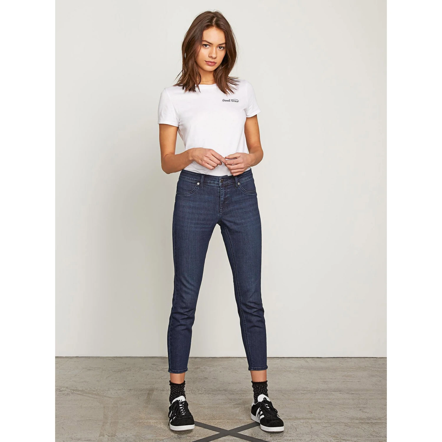 The Liberator Legging has it all, a cropped cut with a figure-flattering fit. Made it our favorite stretchy cotton denim, we’ve added exclusive Volcom touches like logo’d hardware and a vegan leather patch at back. Model is wearing size 26.